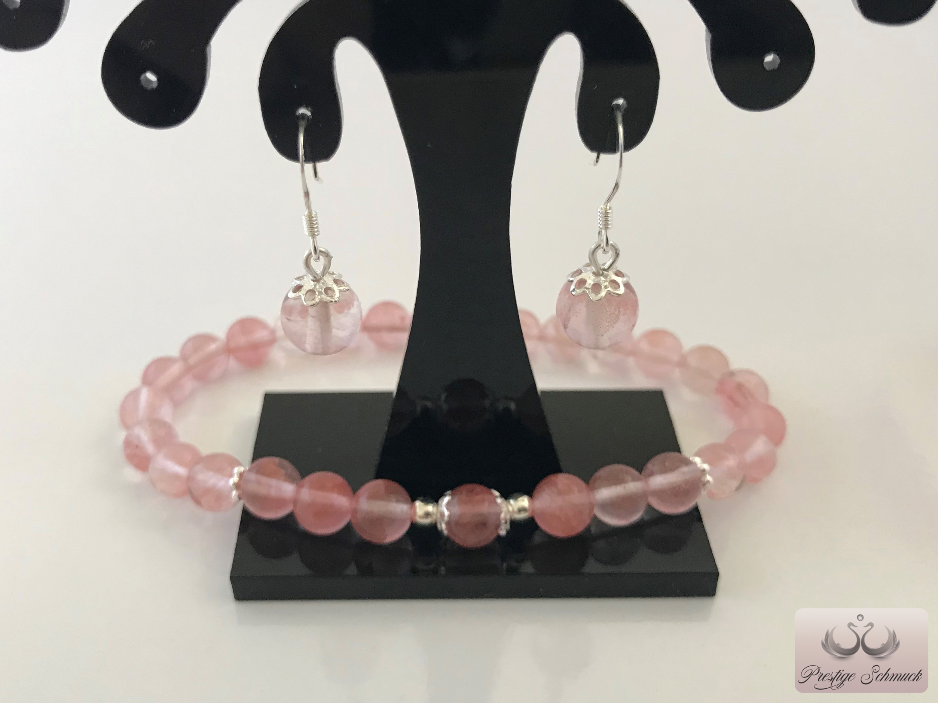 Kirschquarz Armband mit Gummizug und Kirschquarz Ohrringe mit 925 Silber